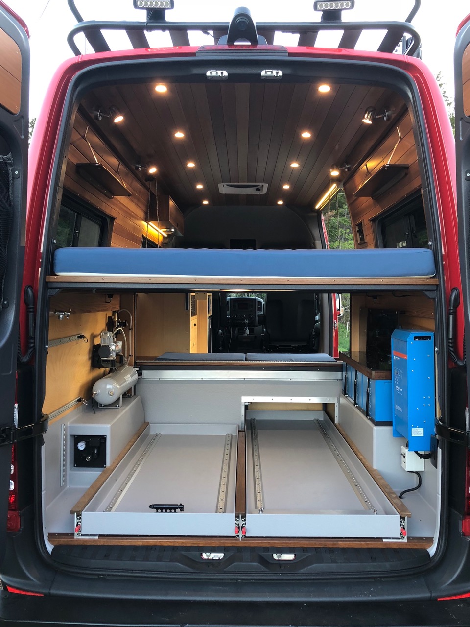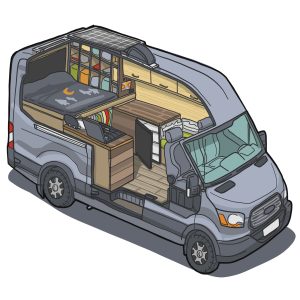 How about a camping van with Smart TV and DVD, sofa bed, A/C D/C refrigeration, dual battery system, a AMA Windows and few extra windows to enjoy the view? A windsurfing van with raised fiberglass top may be more to your liking.